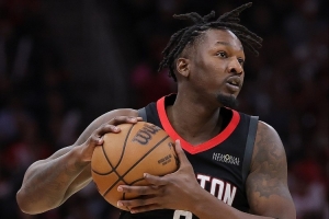 末节最后13秒,芬尼-史密斯开边线球5秒违例,裁判没有吹罚。火箭叫暂停,暂停后再发球,杜兰特完成了致胜跳投。↓