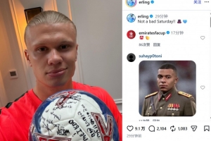 哈兰德也在赛后通过社媒晒出了队友们签名的足球,并调侃道:“周六过得还不错🎩🩵”