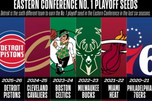 值得一提的是,在过去的六个赛季中,东部第一分别由六支不同的球队轮流坐,分别是76人、热火、雄鹿、凯尔特人、骑士、活塞。