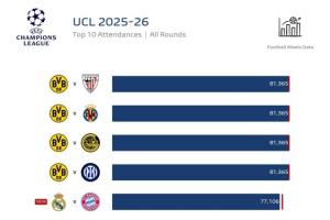 最高81365人!欧冠上座榜:多特4场满座并列榜首,皇马vs拜仁第五