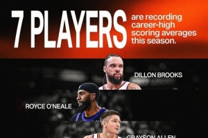 球队配文写道:“全员进化!这就是奥特体系的魔力 ☀️✨ 本赛季,太阳队共有 7位球员 创下职业生涯场均得分新高!”